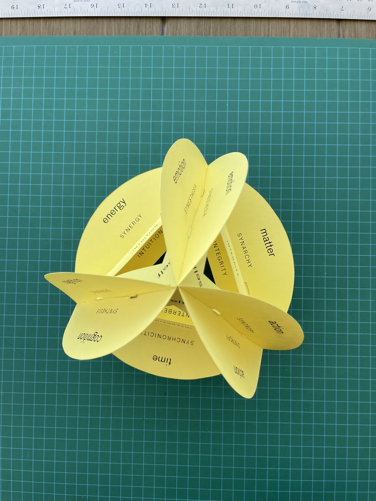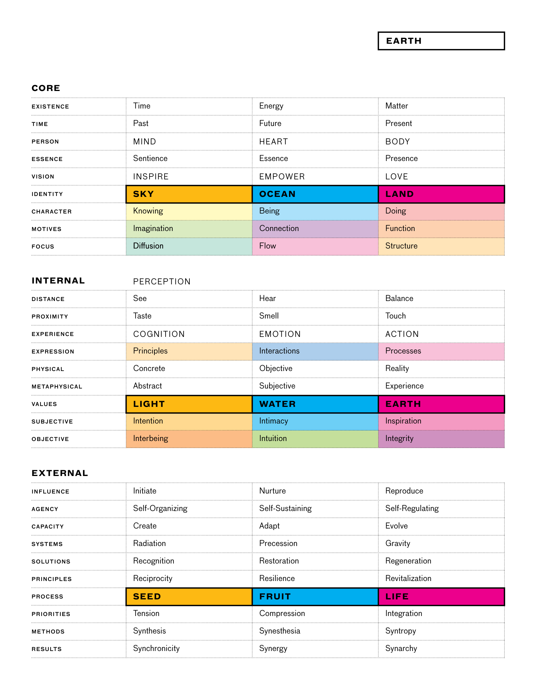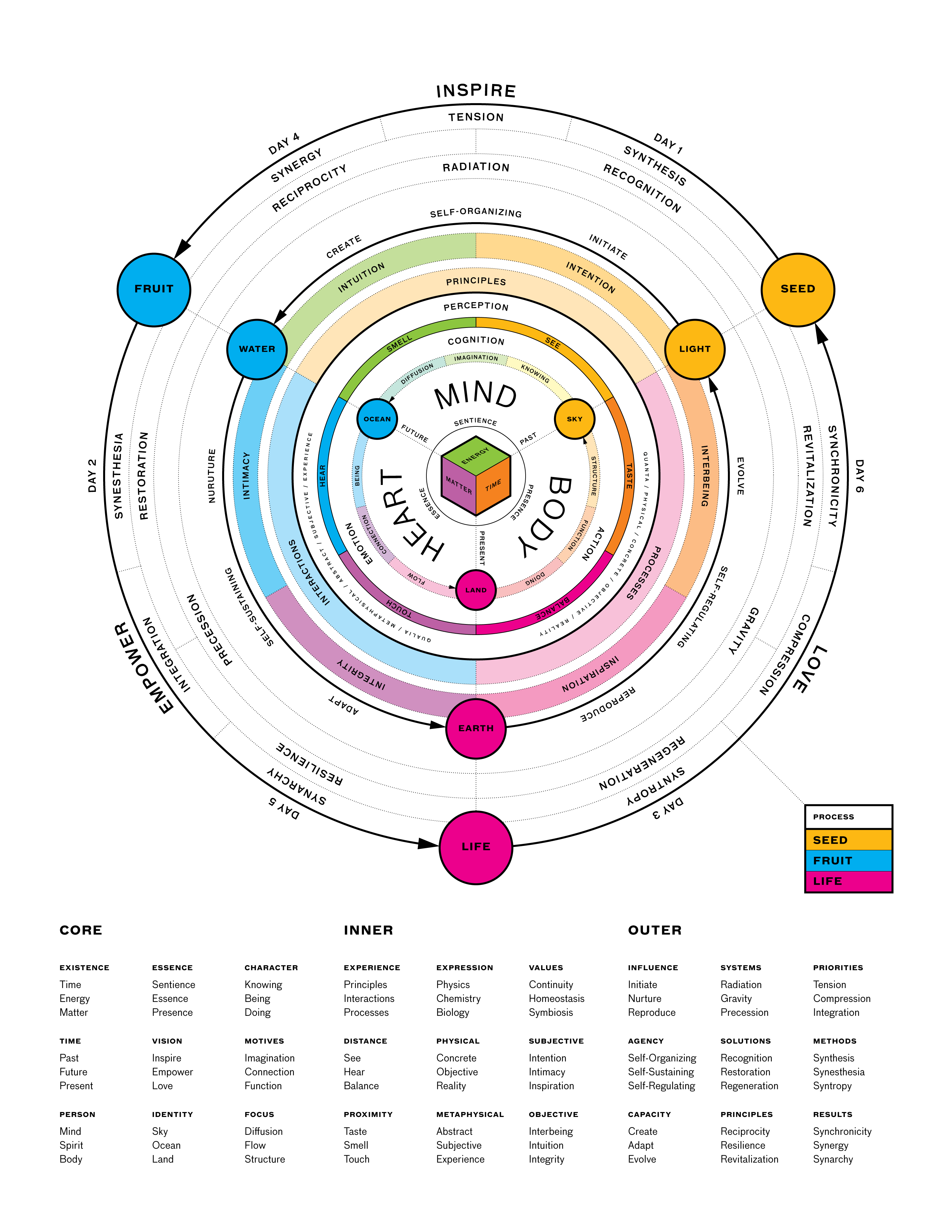 Inspired by the Jewish Torah, the Christian Bible, Buddhist philosophy, Indigenous cosmologies, gravitational theory, quantum physics, and Buckminster Fuller, this mental model for a living being integrates time, energy, and matter with heart, mind, and body to explore the interactions between inner experience and outer reality that create the dynamically emergent qualities of consciousness and life.