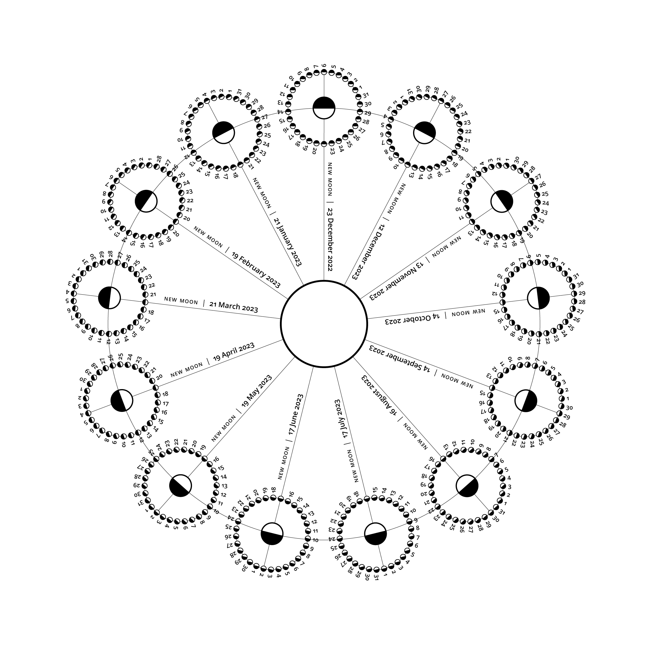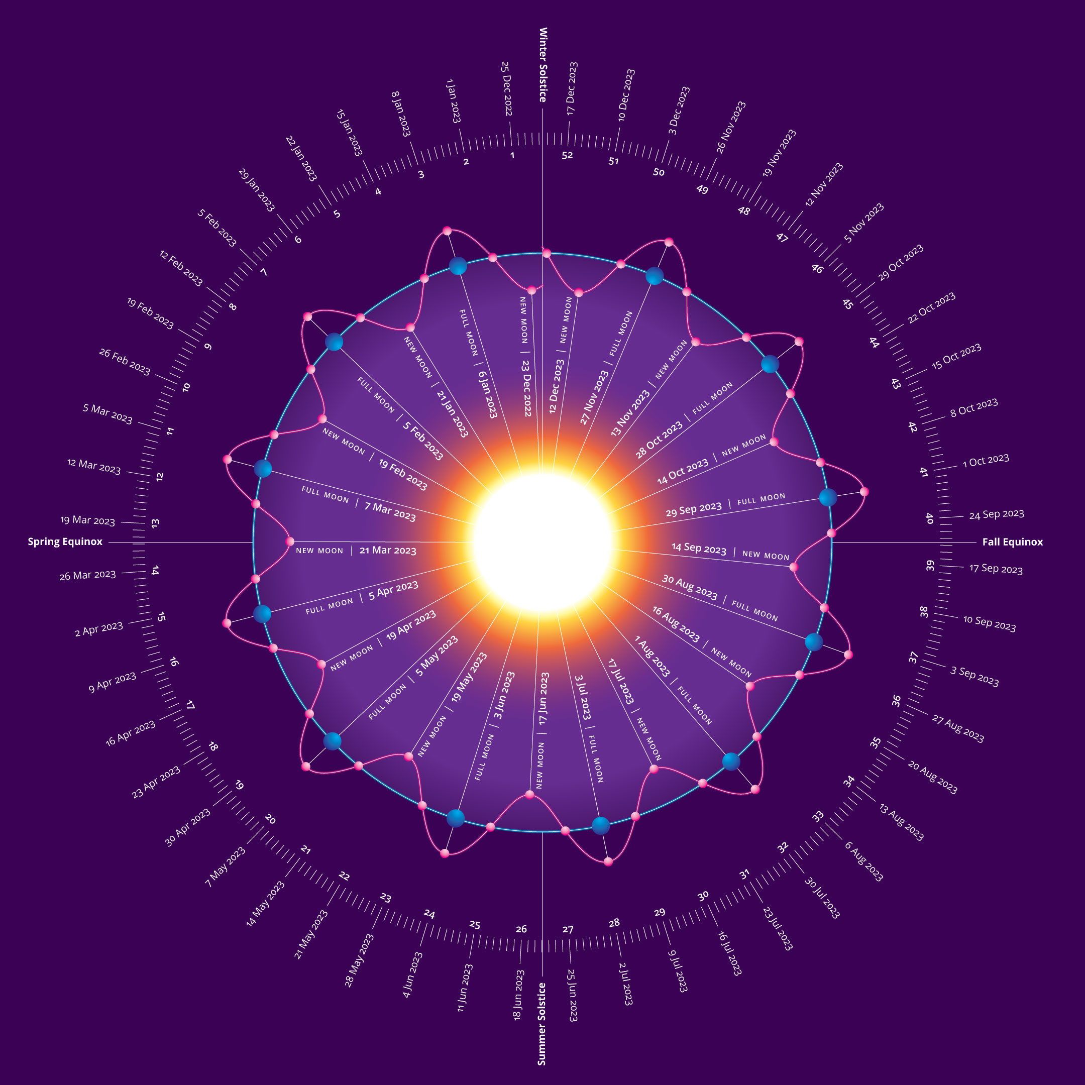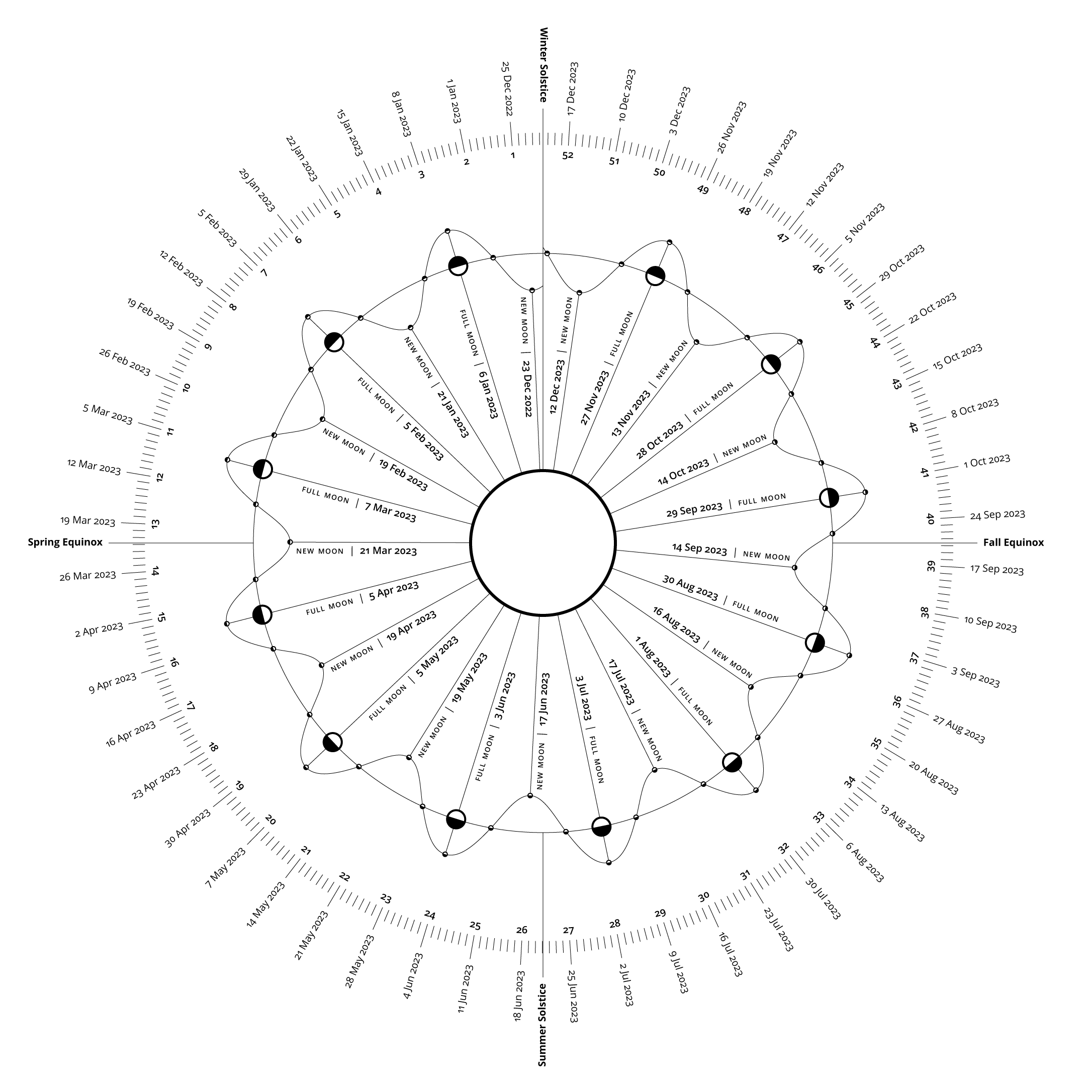 This seems to be the most accurate way I have found to visualize how the cycles compare with each other: daily, weekly, monthly, annual, compared to the lunar cycles, represented as a circular sine wave. The crest of the sine wave is always a full moon. The trough is always a new moon.