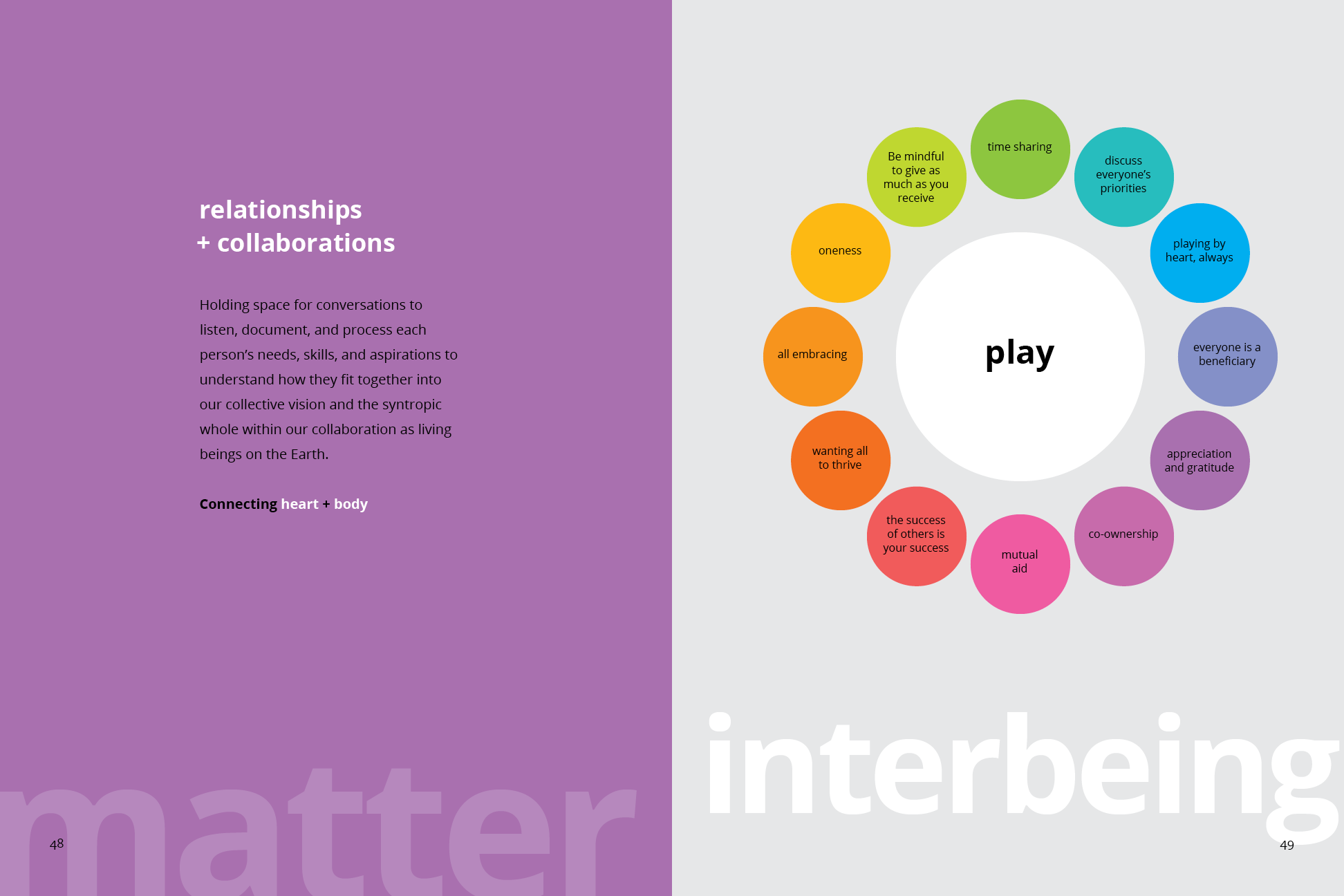 Holding space for conversations to listen, document, and process each person’s needs, skills, and aspirations to understand how they fit together into our collective vision and the syntropic whole within our collaboration as living beings on the Earth.