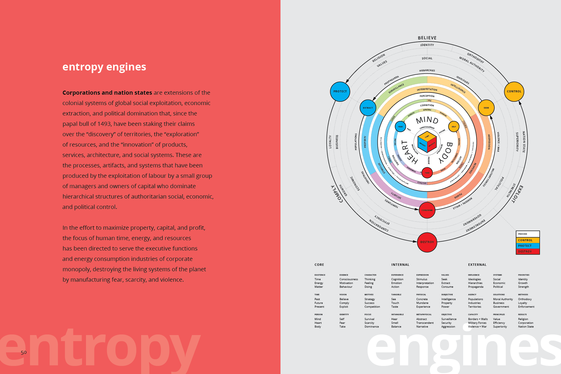 Corporations and nation states are extensions of the colonial systems of global social exploitation, economic extraction, and political domination that, since the papal bull of 1493, have been staking their claims over the “discovery” of territories, the “exploration” of resources, and the “innovation” of products, services, architecture, and social systems. These are the processes, artifacts, and systems that have been produced by the exploitation of labour by a small group of managers and owners of capital who dominate hierarchical structures of authoritarian social, economic, and political control.