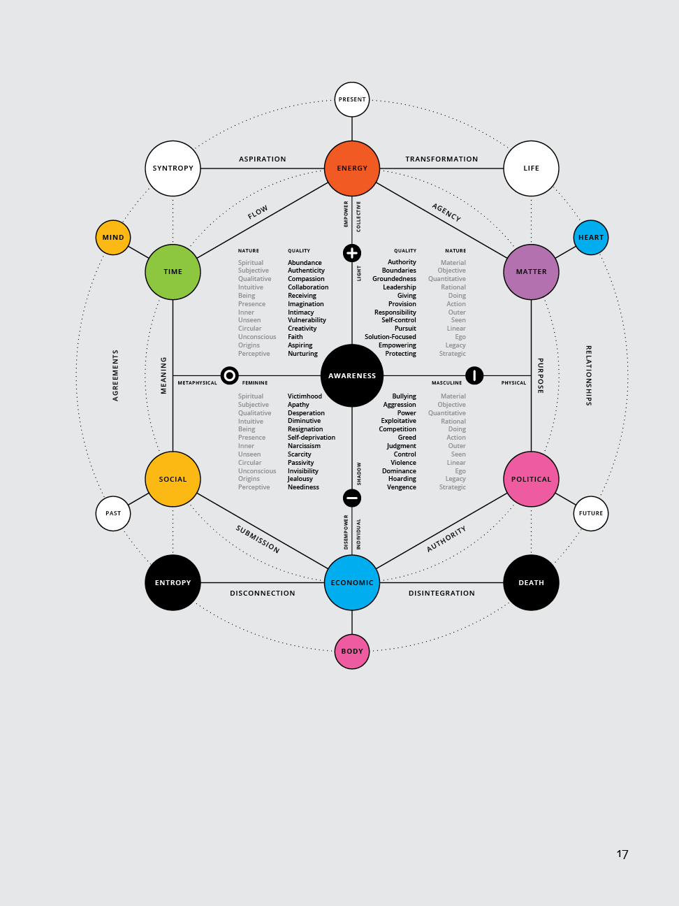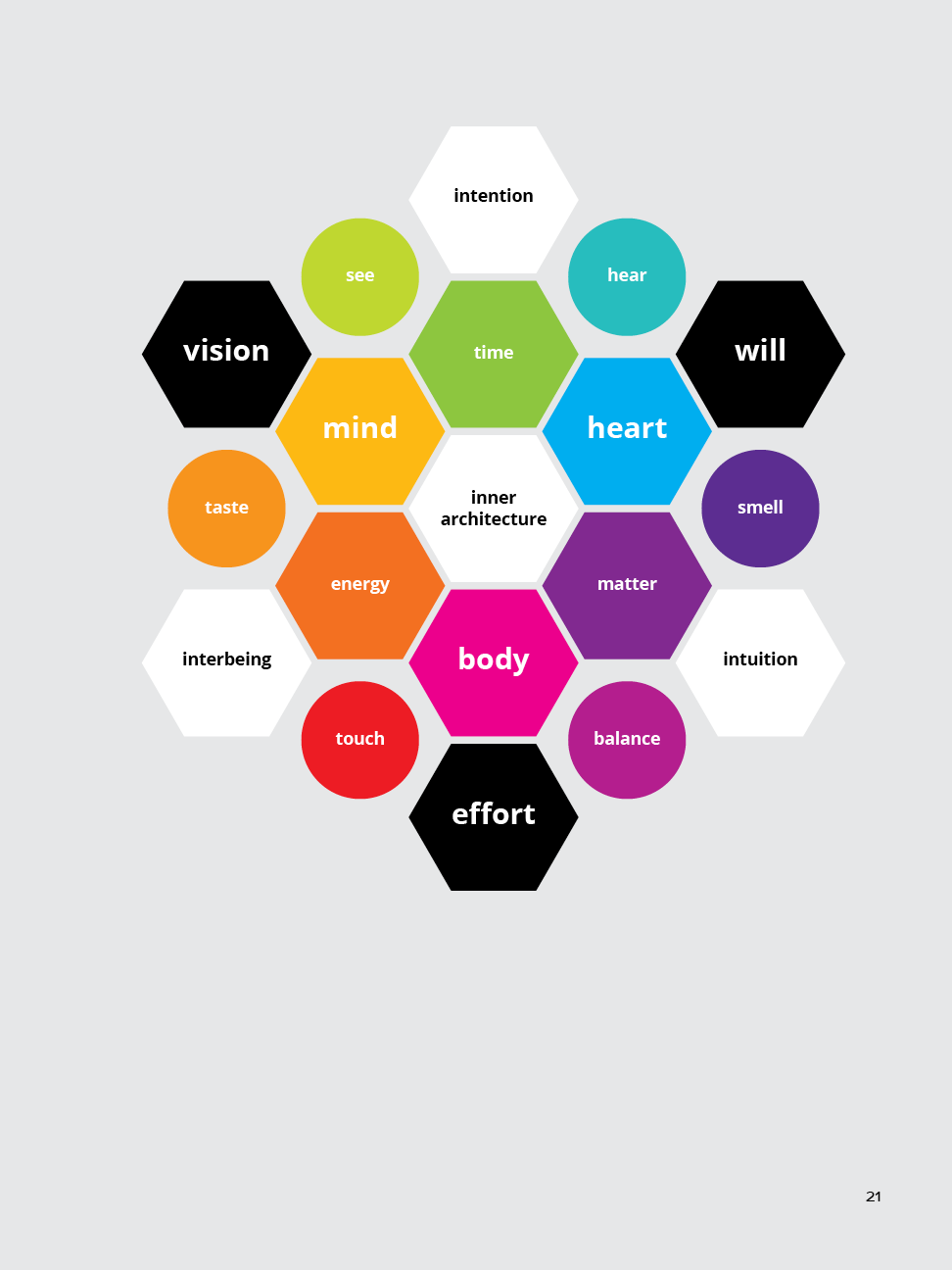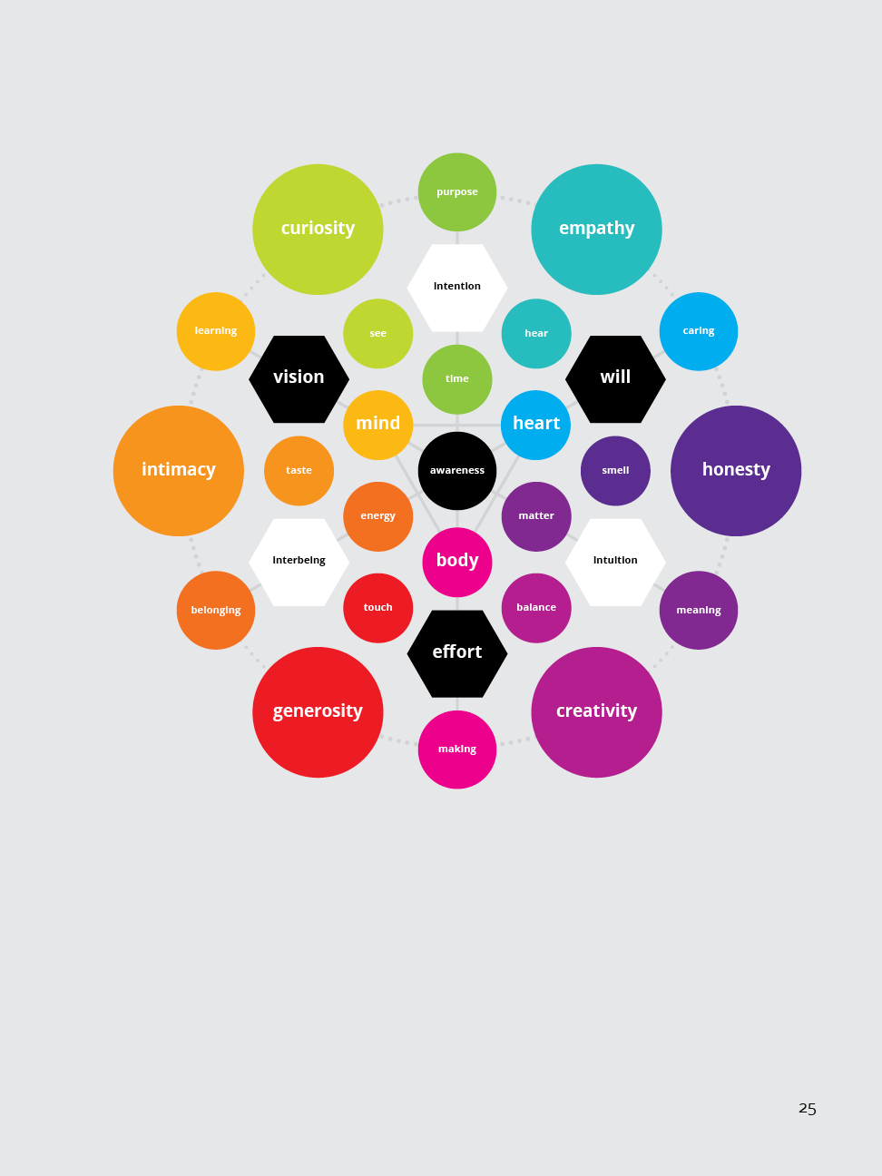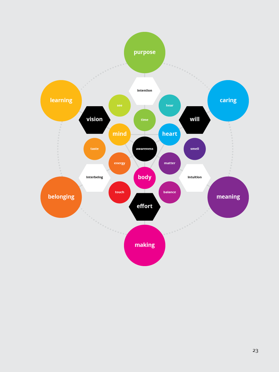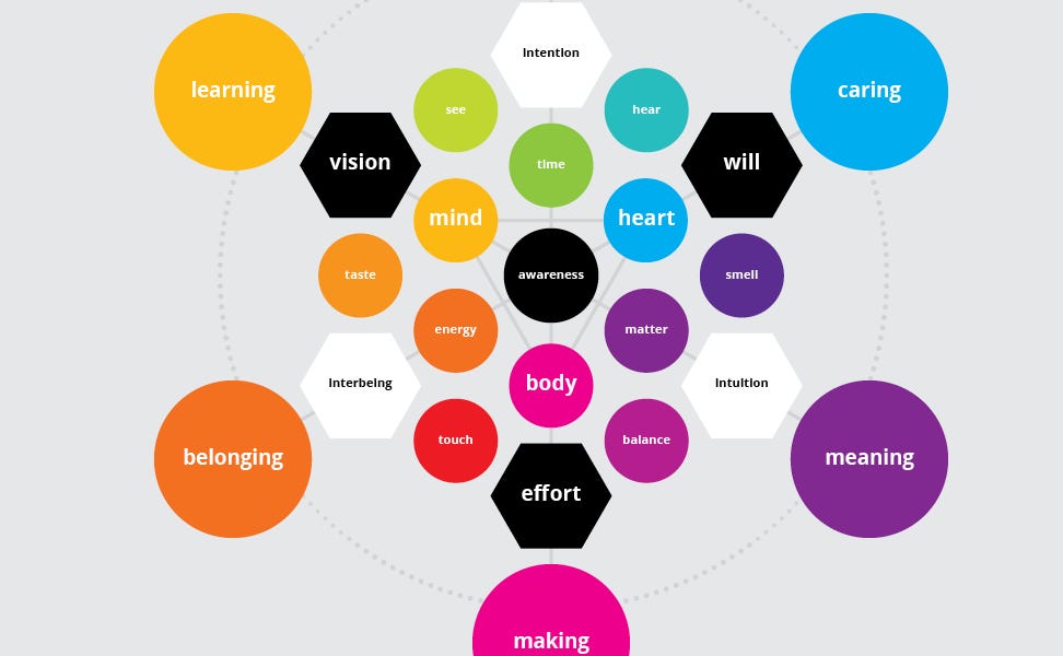 A strong center of awareness supports a focused intention, an embodied intuition, and a connected sense of interbeing that is able to motivate the will to act on the vision through emotional integrity:
