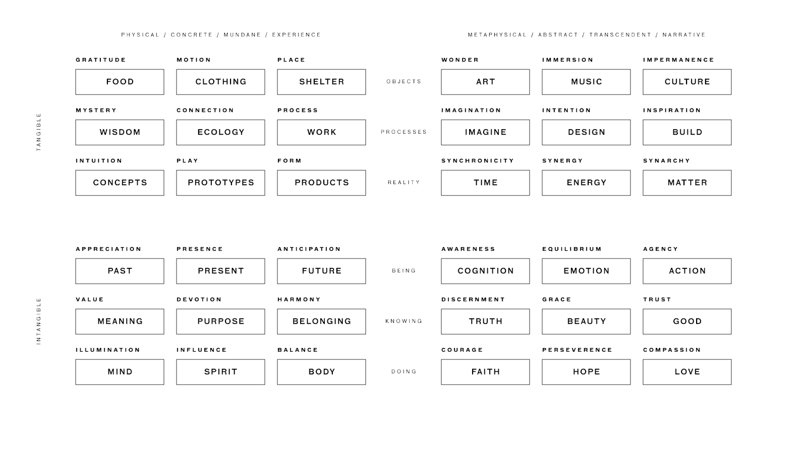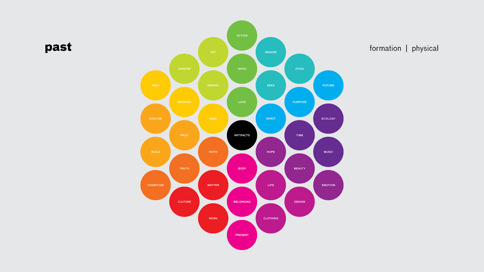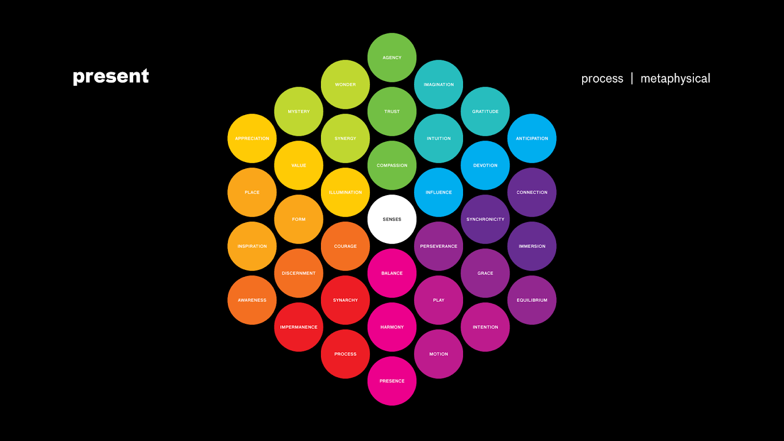 This is the spectrum of colors I play with when exploring how our perceptions, cognition, emotion and action are the raw materials for the process of design. When humans design at scale, we have the power to build cities, transform landscapes, share the experience of a soccer game around the world, and create global economies by believing in stories about money and the sense of value and worth that is created by a shared story about how a number in a bank account or the assessed value of a corporation can make one human more powerful than another.