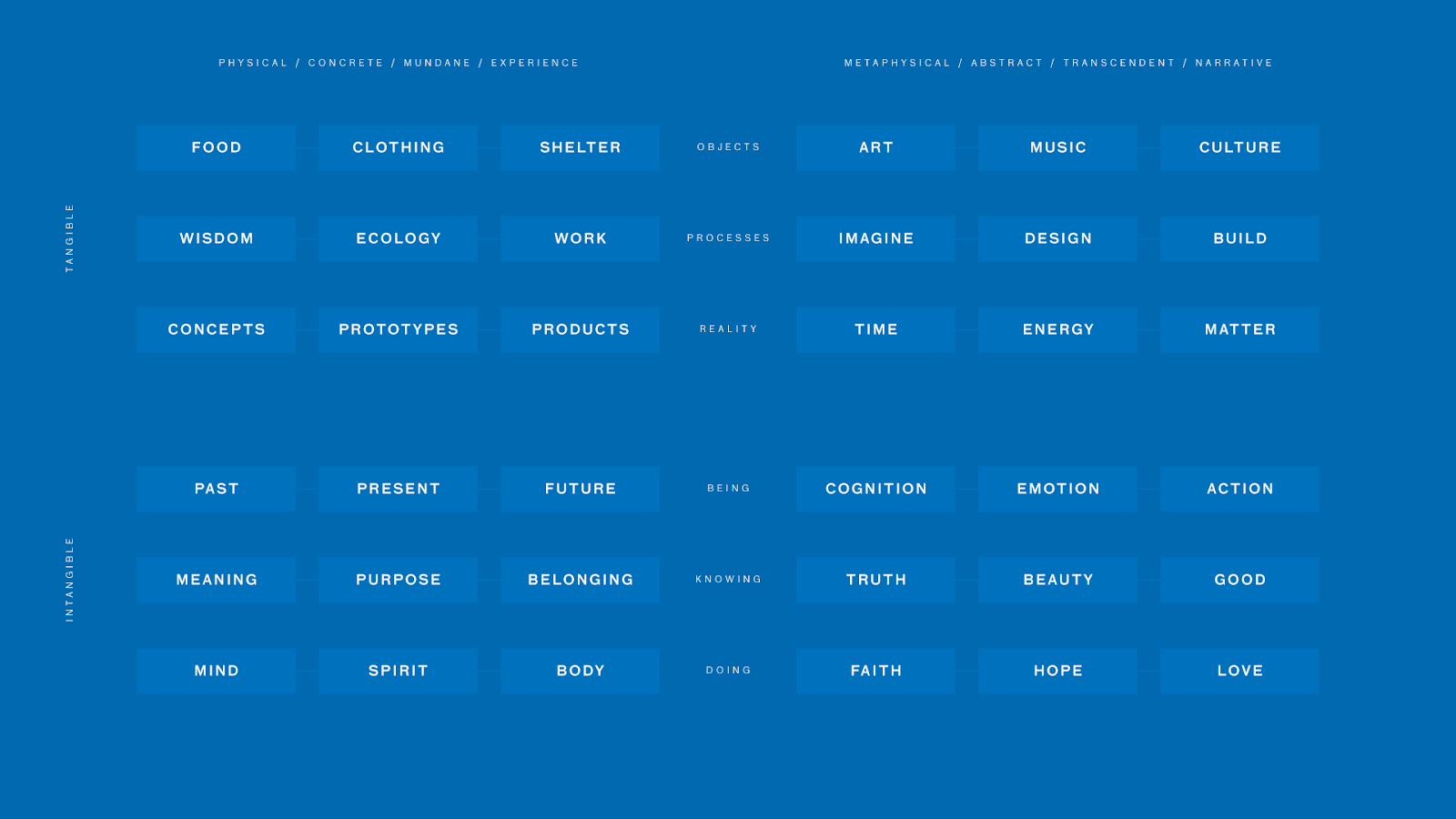The physical layer of the artifacts of life. This is the world of human experience as it connects to full spectrum of the faculties of perception, cognition, emotion, and action.
