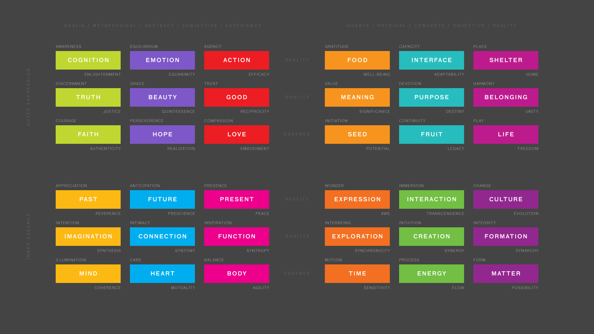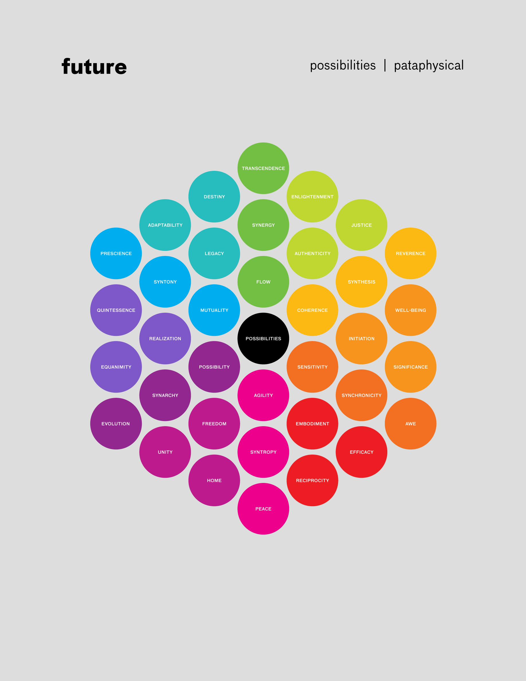 I did not have a clear understanding about what the distinctions were between these parts of the self—mind, heart, and body—and how they are connected to the whole of the universe—time, energy, and matter. I have been exploring experience design and mental models to find ways to understand myself better, but also how to reimagine our social architecture based on a holistic conception of the self, integrating physics and metaphysics to recognize that what grows from the interaction of the two is pataphysics—senses, spirit, and soul.