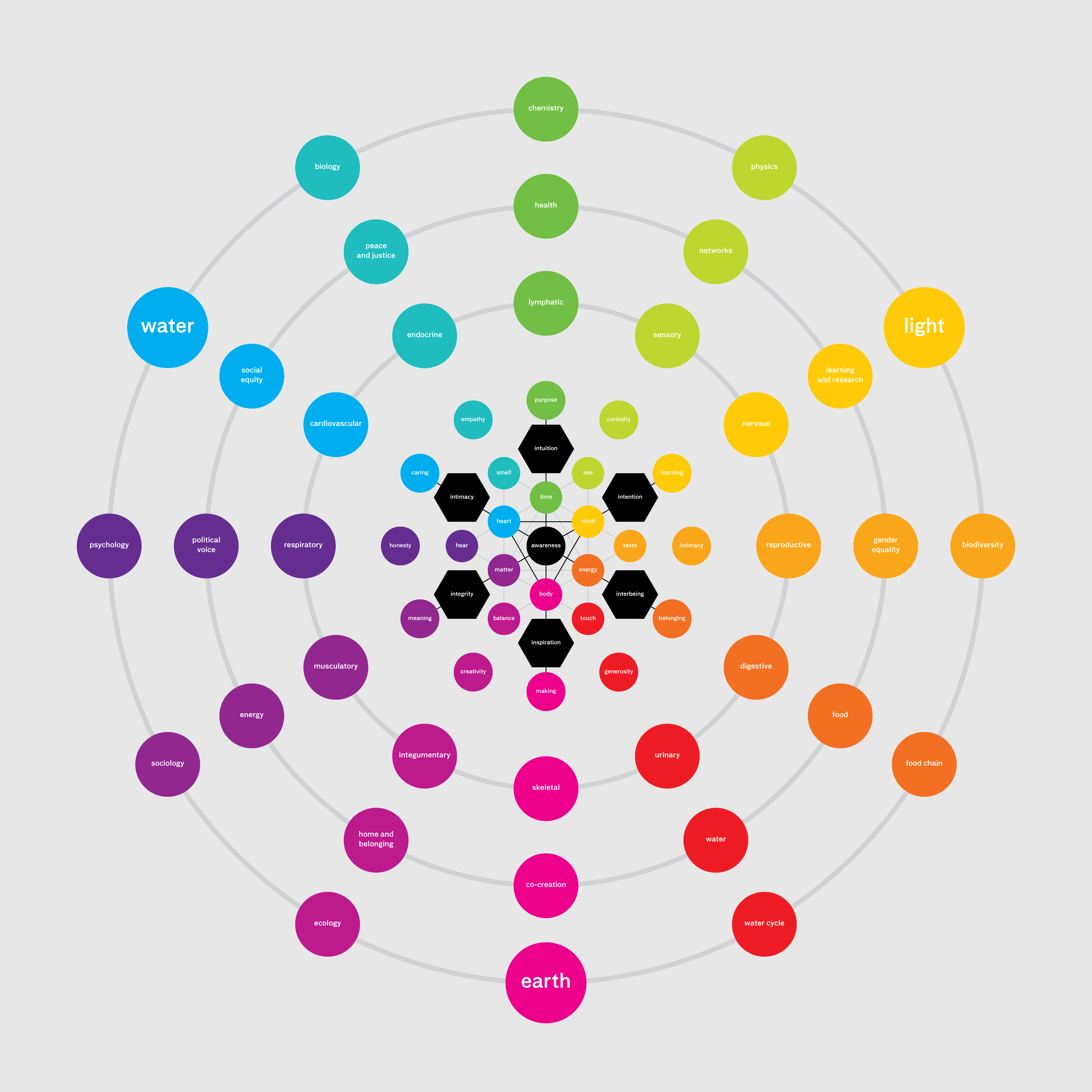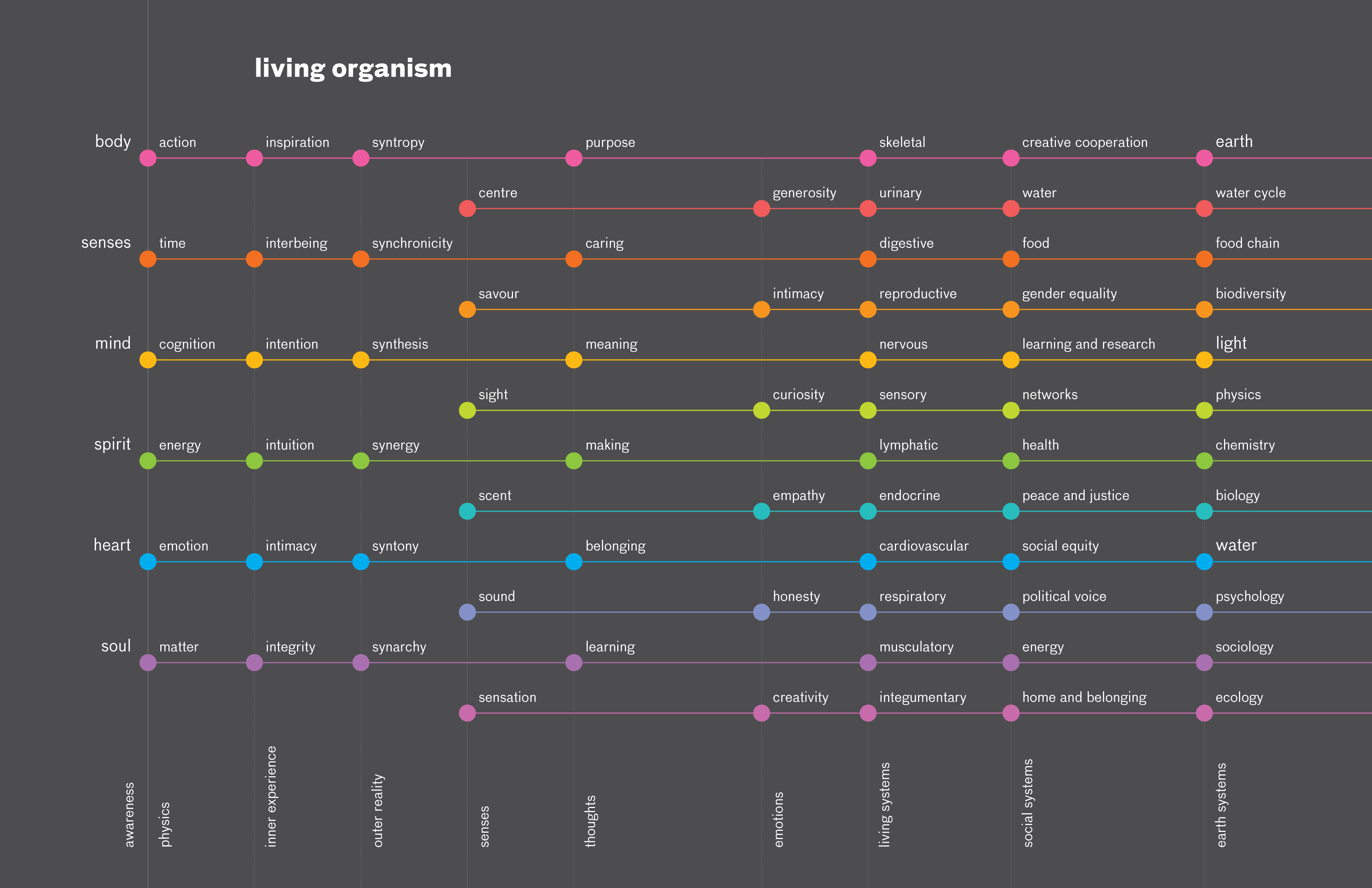 This overview of the design of living systems arranges all the elements of the universal principles into a horizontal linear structure, rather than the radial structure of the universal principles in the previous image. It also adds categories for each of the concentric circles that flow from the centre of awareness: physics, being, integrity, senses, thoughts, emotions, living systems, social systems, earth systems.