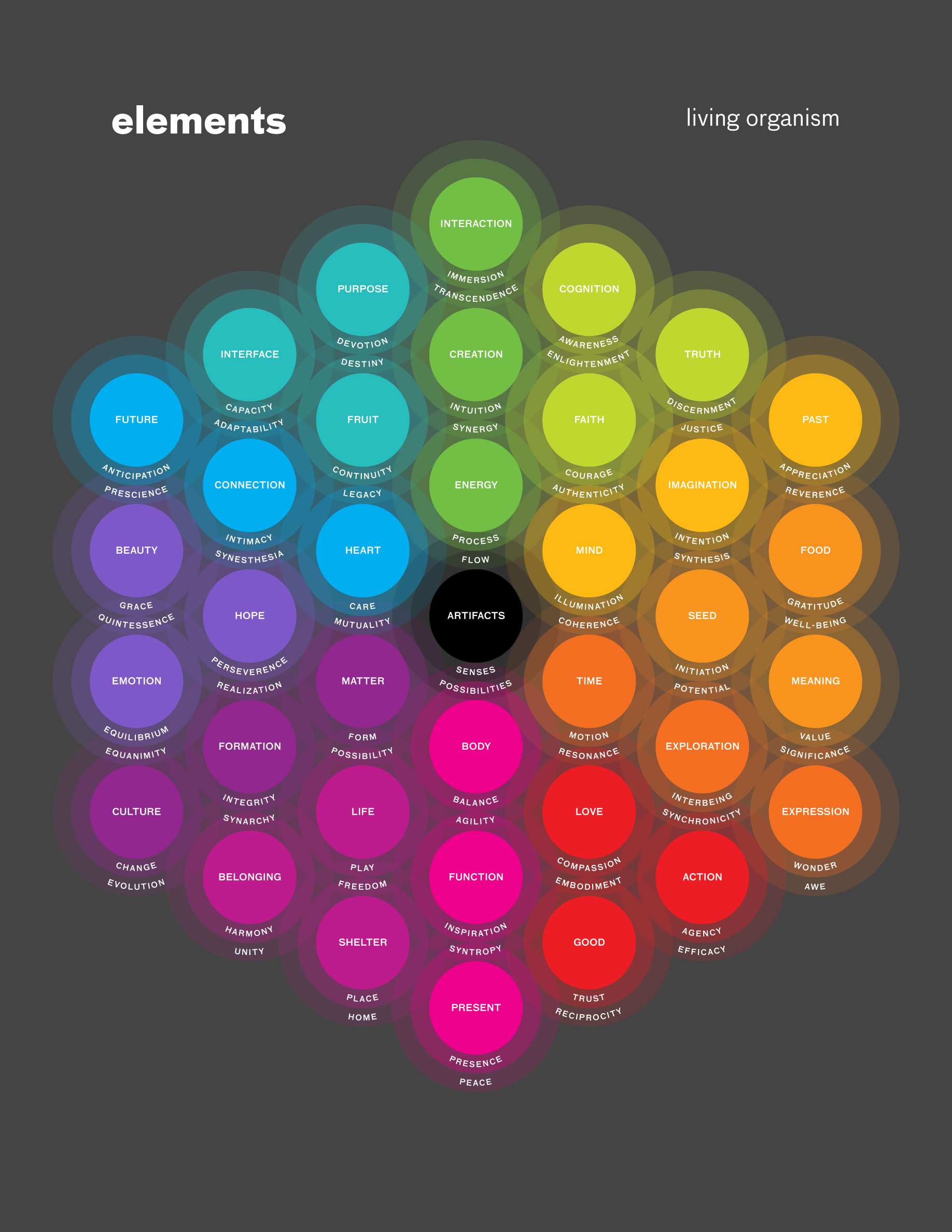 The triads are distributed around a hexagonal colour wheel to form a holistic model of the experience of being alive. The periodic table of elements is a living model that helps us understand the cycles of life.