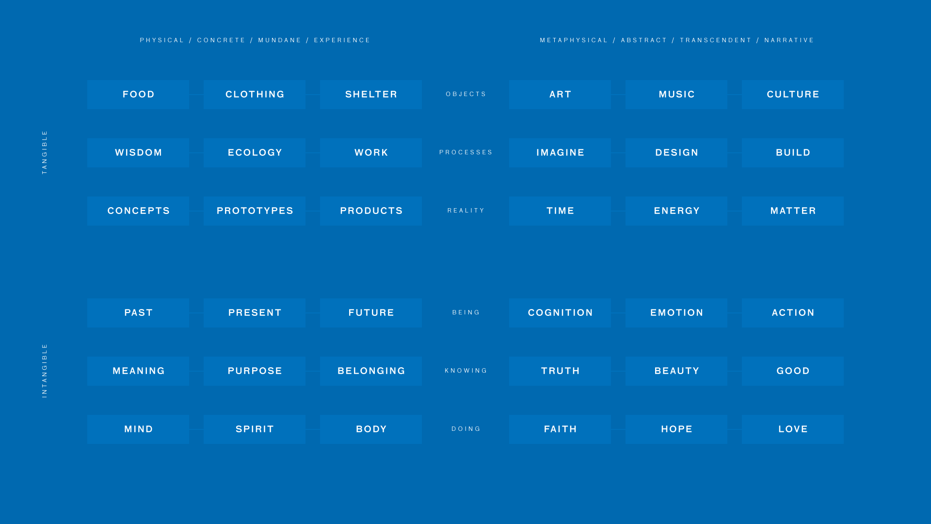 In that sense, the Bauhaus, as a synthesis of science and art, represented a recognition of both the physical and that which was beyond the physical: the metaphysical. Human consciousness and experience are beyond what the physical sciences are able to understand. Art is the way we explore the senses, the mind, the heart, and the body. Jesse James Garrett of Adaptive Path expands the artifacts of design to include perception, cognition, emotion, and action to correspond with this four-fold conception of human experience in his talk on design for engagement.