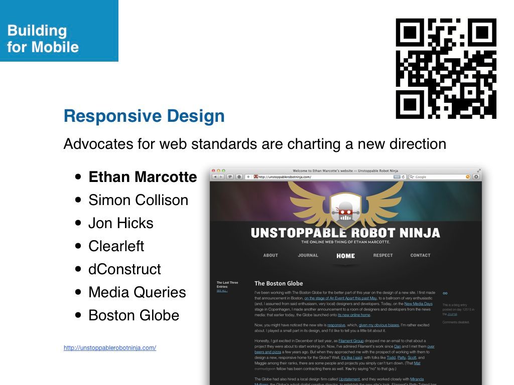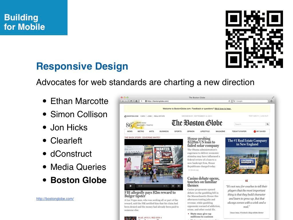 Ethan Marcotte helped launch the Boston Globe’s responsive web site the same week that we presented our Mobile Web workshop.