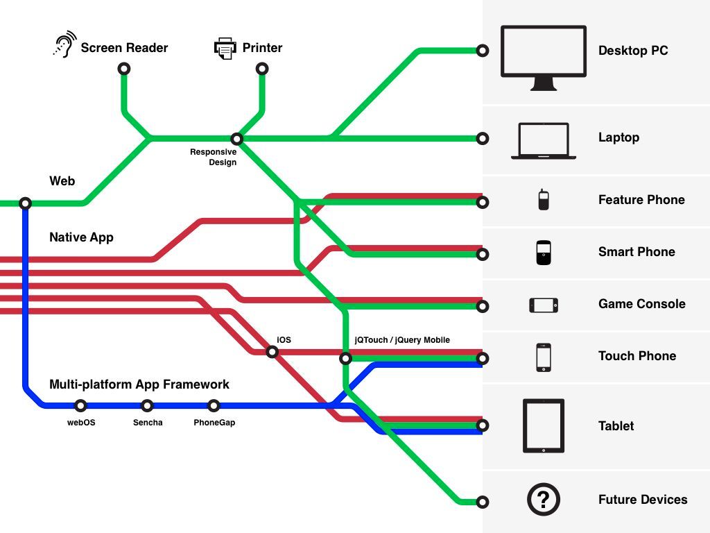 To clearly communicate the benefits of responsive web design, I created a transit map of the mobile web, indicating in red the costly and time-intensive routes to take when developing individual apps for each of the destination devices.
