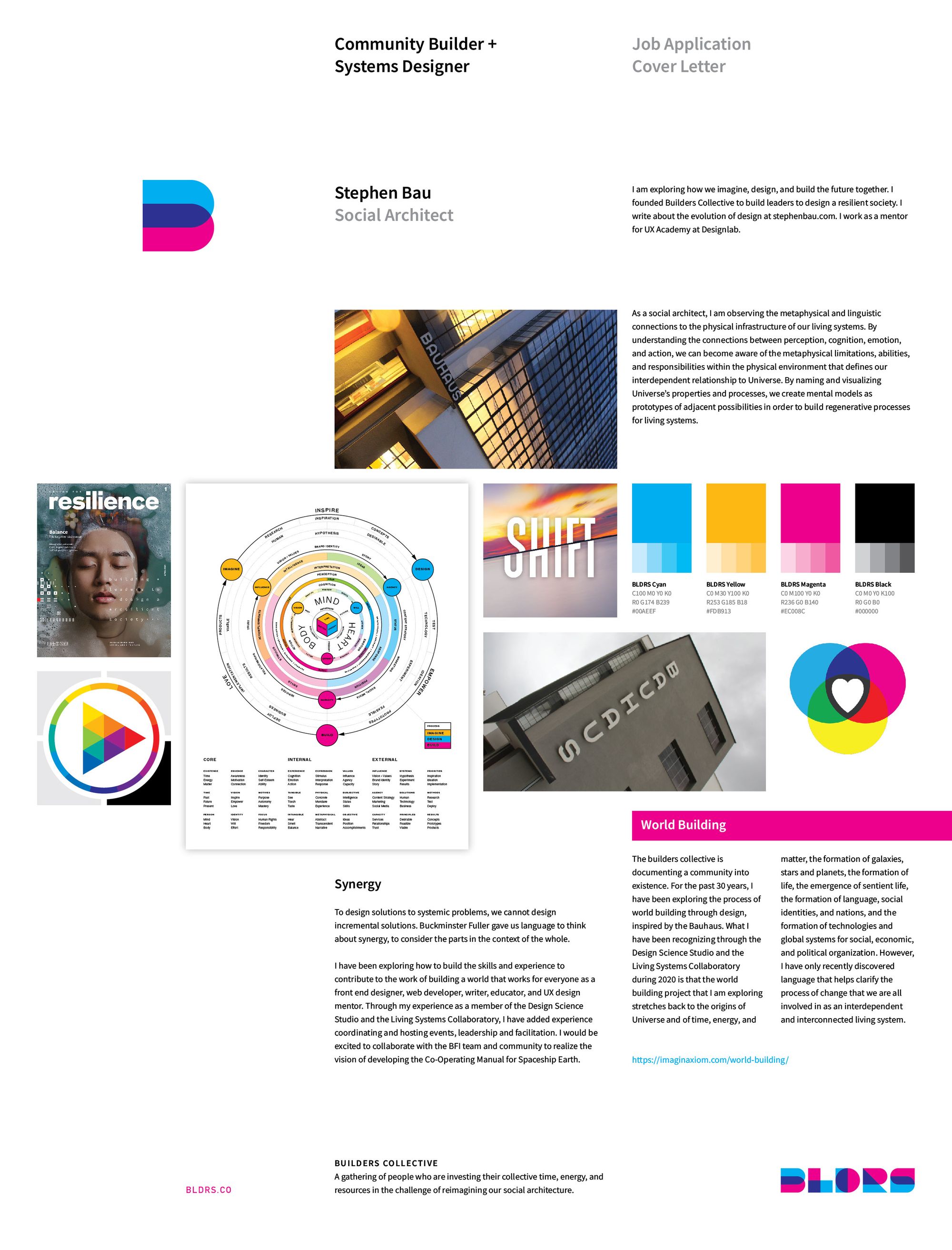 With a two-page cover letter, I tried to communicate the synergy between my life’s work and the work of Buckminster Fuller to communicate the center of gravity, the force that holds everything in tension as synergy in constant motion.