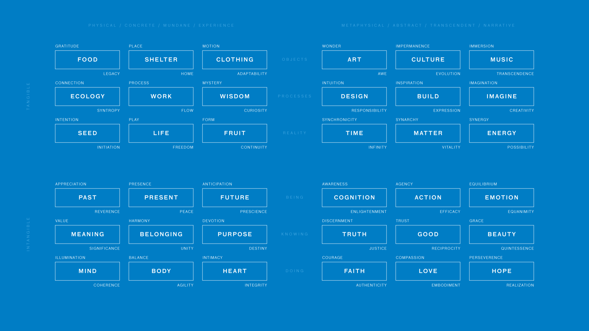 This article is an update of the previous article, A Year In The Life. I spent some time observing how these ideas have evolved over time. I went back to review the matrix for human experience that grew out of my exploration of topics for a magazine about love. I was trying to define a life of love as something that gets us out of the pyramid of Maslow’s hierarchy of needs by exploring the full range of human experience from basic human needs such as food, clothing, and shelter all the way to aspirations of transcendence that I derived from what is often referred to as the love chapter in the Bible: “faith, hope, and love. And the greatest of these is love.” I rearranged the columns from the original and moved away from a product-oriented process to an organic living process in some of the language I was using. These terms are the artifacts—the seeds—from which I cultivated and grew the senses and the possibilities, the seeds of love.