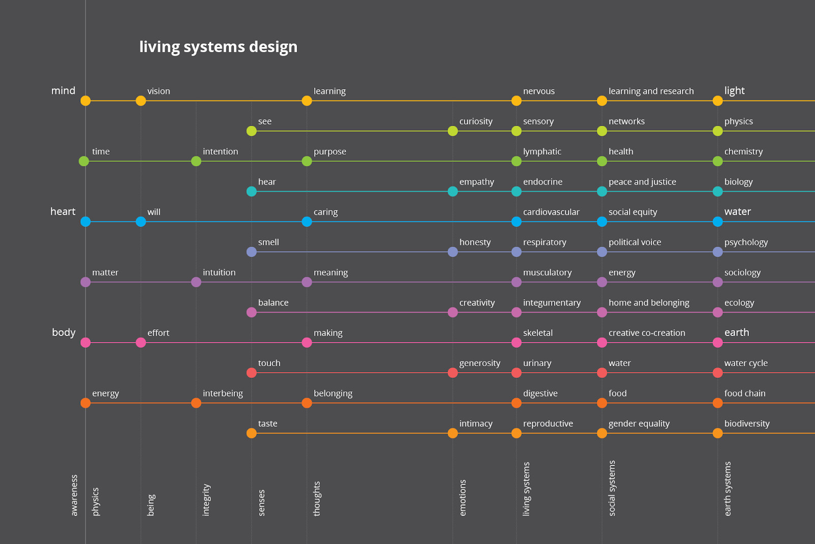 This overview of the design of living systems arranges all the elements of the universal principles into a horizontal linear structure, rather than the radial structure of the universal principles in the previous image. It also adds categories for each of the concentric circles that flow from the centre of awareness: physics, being, integrity, senses, thoughts, emotions, living systems, social systems, earth systems.