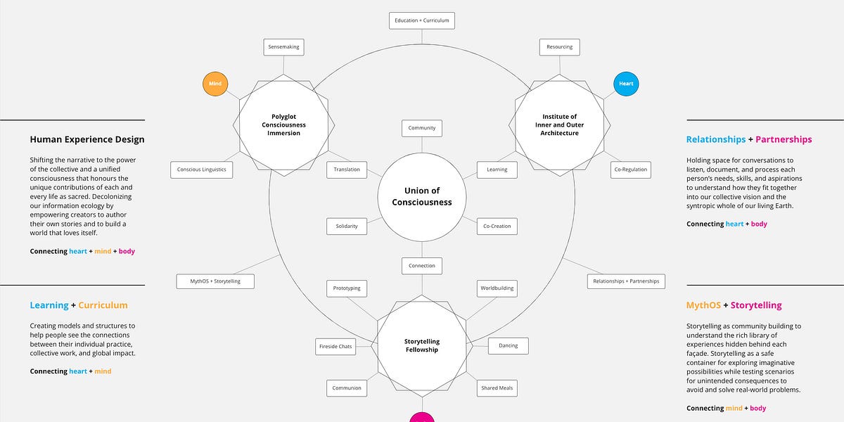 During a session of the Design Science Studio featuring Javier Senosiain presenting on biophillic design + architecture, Session 39: Thursday, March 17, 2022, the chat discussion in the Zoom session included a reference to a multi-lingual learning environment, Polyglot Consciousness Immersion. Combined with the proposal for an Institute of Inner and Outer Architecture and a Storytelling Fellowship, this became the inspiration for the design of a social architecture for a Union of Consciousness, representing a model for a holistic human experience design community.
