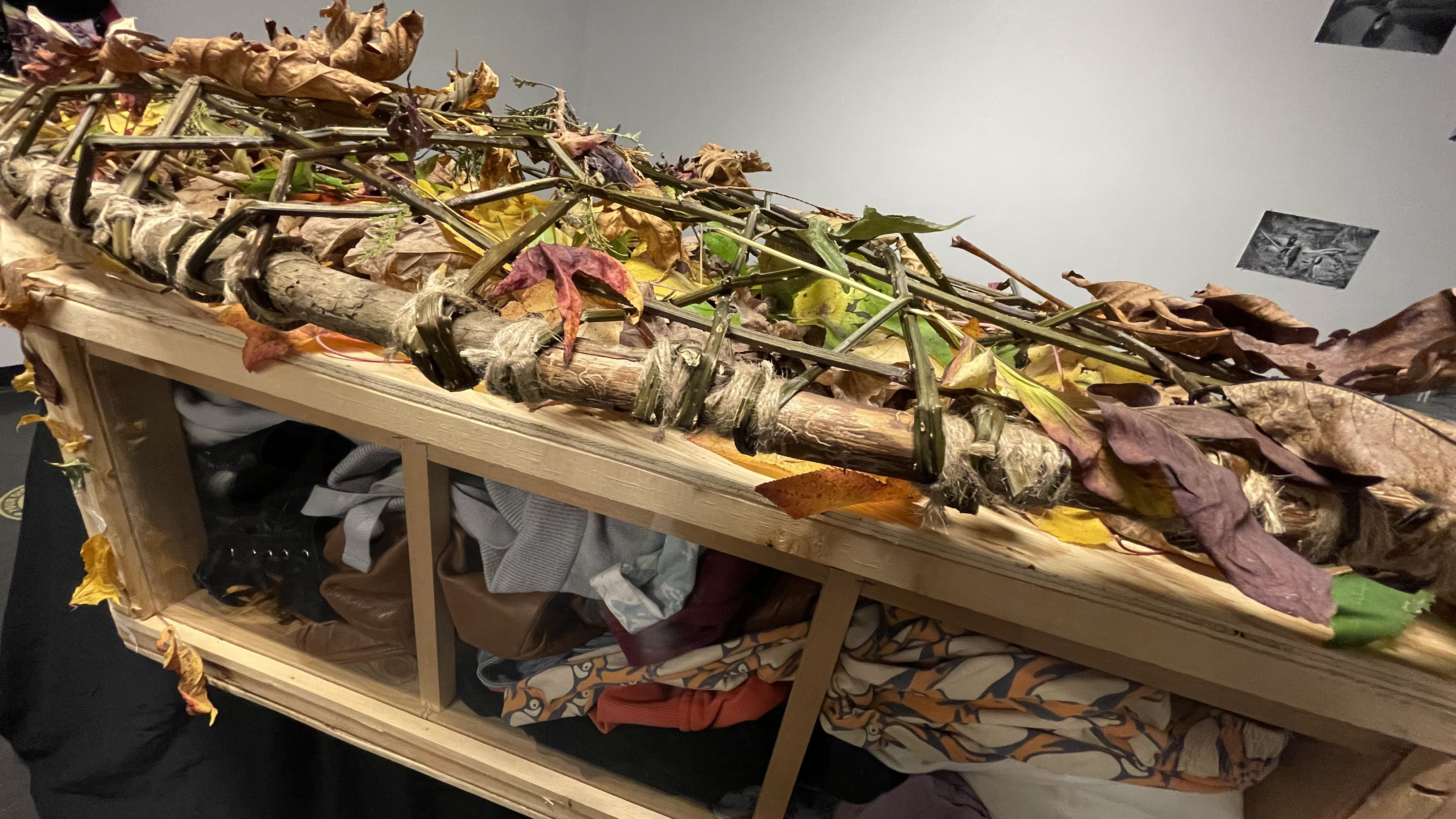 Our project is a sculpture in the form of a coffin filled with clothing. The cover of the coffin is woven together with materials from a forest that will likely be destroyed for suburban residential development.