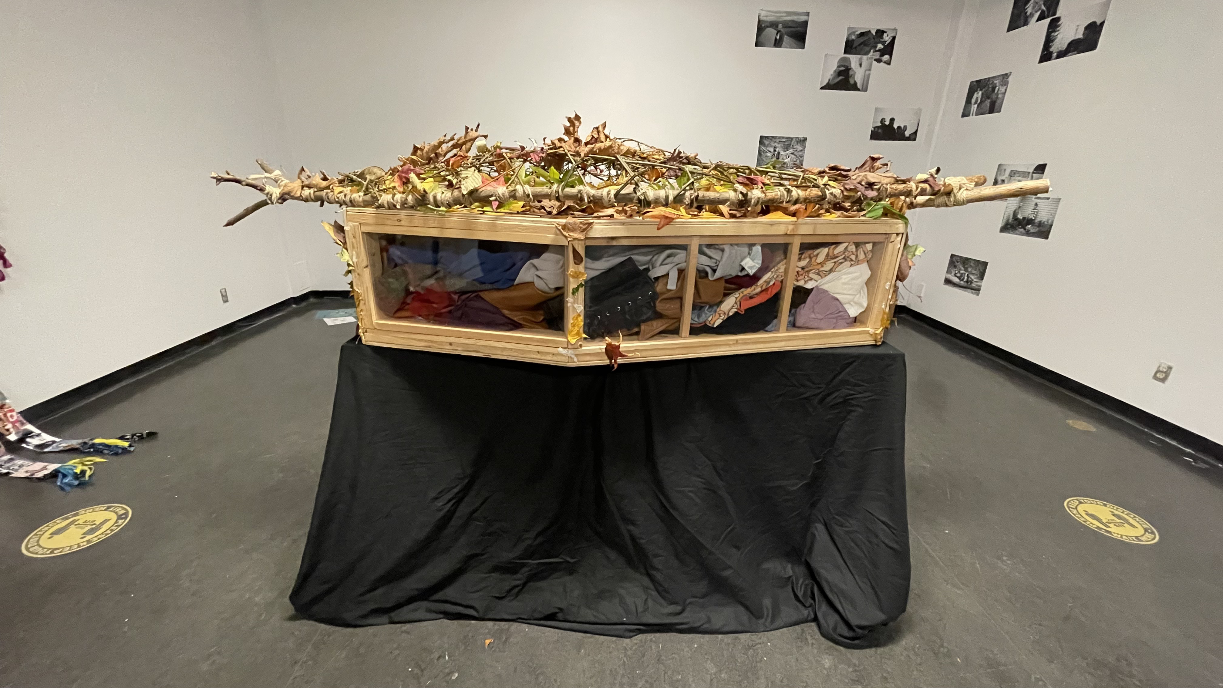 We created a wooden coffin with clear acrylic sides filled with clothing, to express the death of the environment due to clothing production. We then covered the coffin in natural materials such as branches, vines, and leaves to further promote the idea of the clothing becoming one with the earth after exploiting materials. Due to cost and transportation, we had to downsize our project, thus making it less life-sized as we were hoping for a little less than double the size originally.