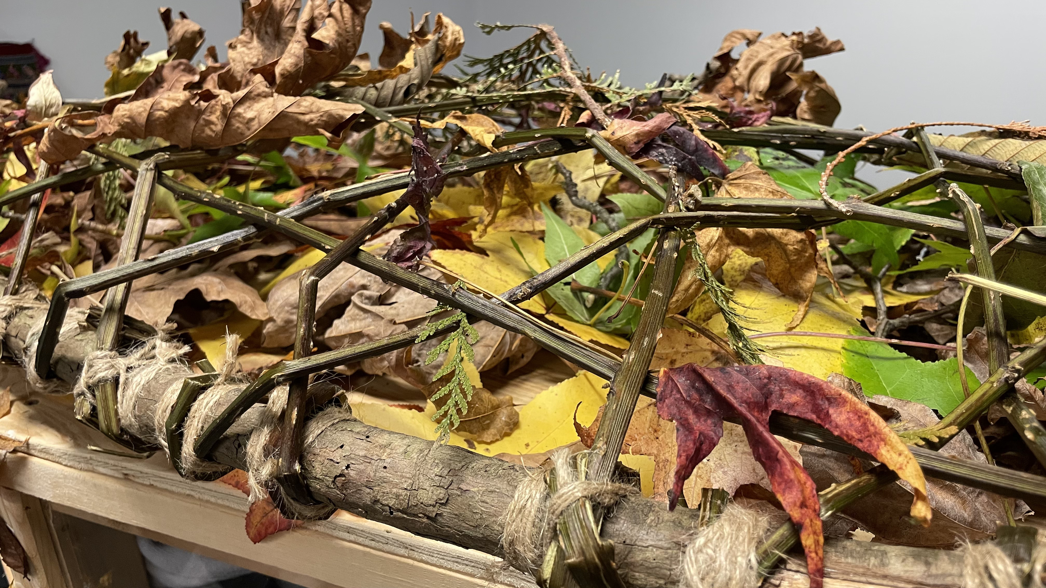 The covering of the sarcophagus weaves together materials found in the forest that has grown over the past 20 years on land zoned for suburban residential development and owned by foreign investors on Sumas Mountain, on the unceded territory of the Semá:th people, known as the Sumas First Nation.