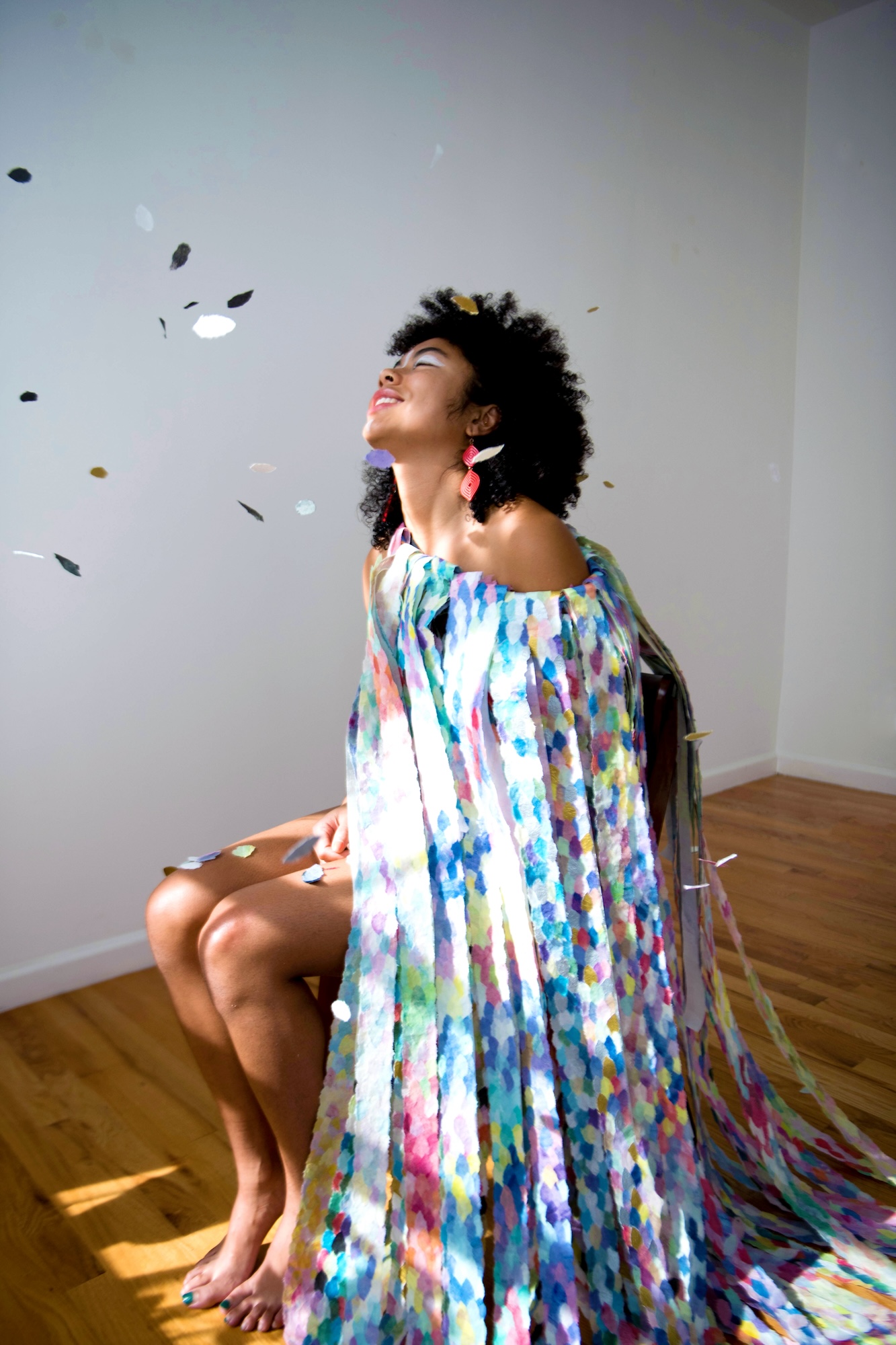 The Zero Field can transform its shape and function. The multivalent artwork was worn by several mixed-race models for a photoshoot. The colors merging with unbounded humans: no border, no division, no deficiency. The elements of the artwork become their scales, feathers, flower petals, waterfalls, particles of light…